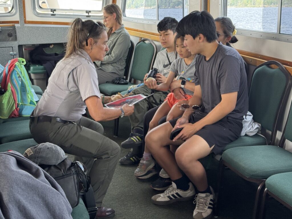 In listening to ranger leading the tour, we realized we were saying it wrong: a fully Americanized hard “voy-a-jurs.” The correct pronunciation requires you to imagine yourself wearing a fine French beret, holding a croissant with your pinky up, and slurring the ending, such that it comes out “voy-a-jheeee-uhrrrs.” Heavy on the smarmy slur. Practice. She did an admirable job of trying to keep the banter going and providing show-and-tell items, but there’s only so much you can do with a bunch of water.