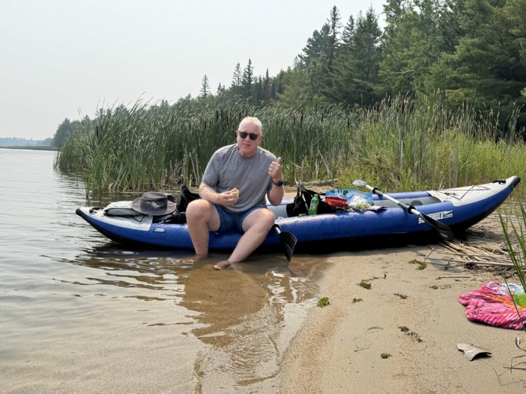 We took to the water from the Kabetogama Lake boat dock in our inflatable Sea Eagle kayak and explored the shoreline. During a waterside picnic lunch, deer were literally crashing out of the woods, loons and ducks were floating on by, and I just might have made an application video for the Survivor TV show. Truth, or fiction?