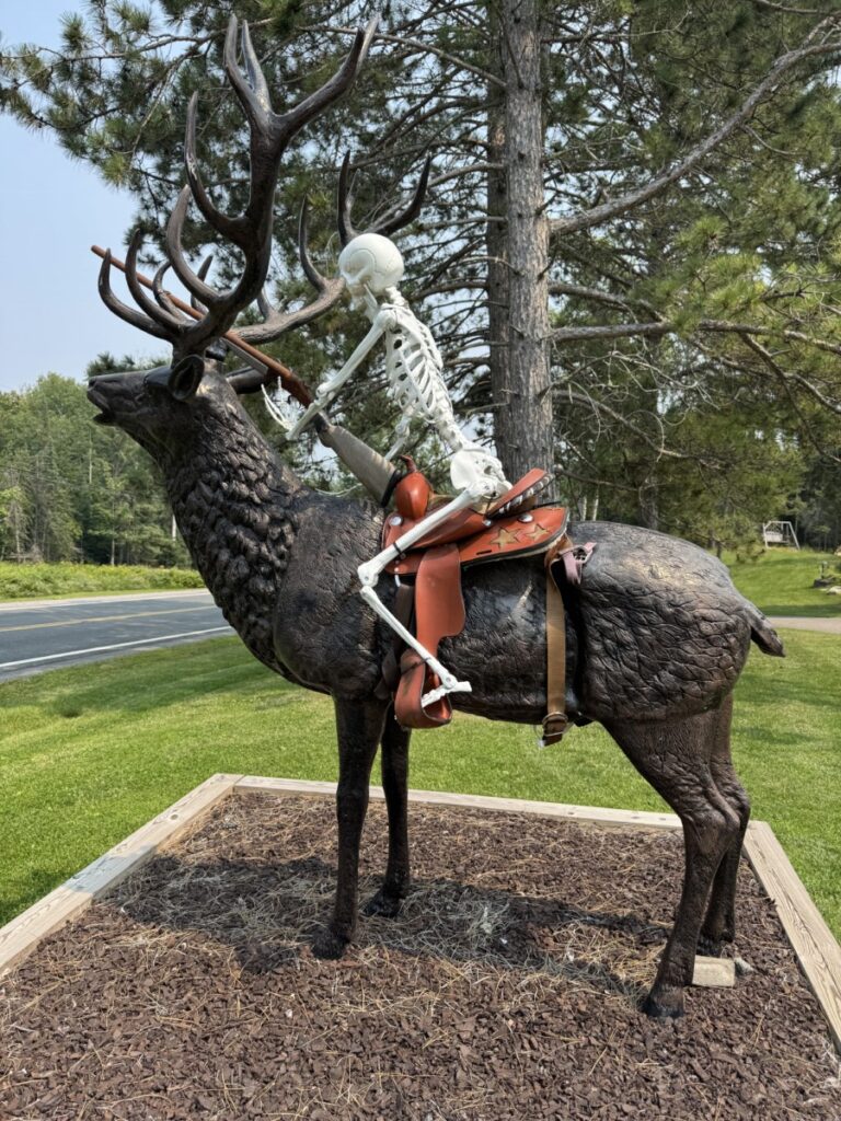 They clearly like big things around here — Philip rides a big fish, a gun-totin’ skeleton rides a big elk.