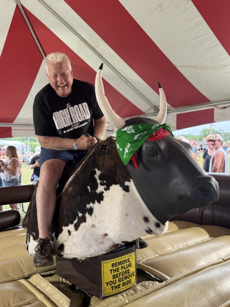 Philip realized his lifelong dream of riding the mechanical bull, lasting a full four seconds to the roar of the crowd.
